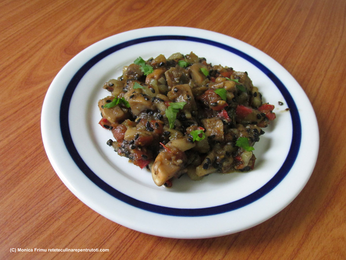 Curățăm și tăiem usturoiul, ardeii, mărul, castraveciorul mărunt, roșia cubulețe, ciupercile cuburi. În uleiul încins pe foc mare prăjim usturoiul și ardeiul iute 30 secunde. Adăugăm ardeiul gras, amestecăm 3 minute, punem ciupercile și fierbem, la foc mai mic, până se înmoaie și scade zeama. Adăugăm roșia, mărul, castraveciorul, sare și piper după gust, coriandrul, condimentele și fierbem, pe foc mediu, până se formează un sos. La sfârșit punem susanul, amestecăm 1 minut și stingem focul. Servim presărat cu pătrunjel verde tocat.