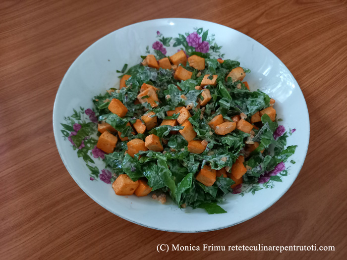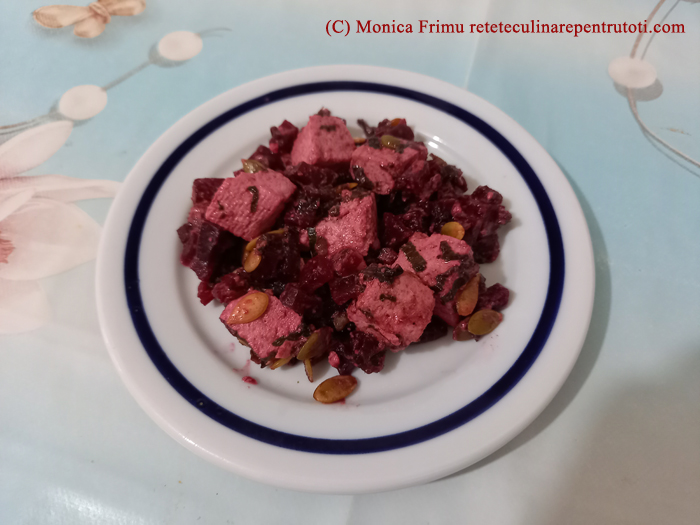 Salată din frunze de sfeclă roșie și spanac cu tofu