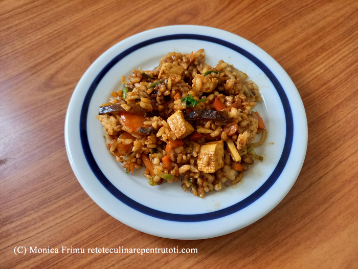 Scurgem tofu, tăiem cuburi cu latura de 1 cm și presărăm 1 linguriță condimente chinezești. Curățăm și tăiem partea albă a cepelor rondele fine, cozile fâșii pe diagonală, ghimbirul mărunt.  Într-o tigaie cu fundul gros încălzim uleiul pe foc mediu, punem ghimbirul, partea albă a cepelor și amestecăm 1 minut. Adăugăm legumele congelate și gătim 5 minute. Punem tofu, praful de chimion și amestecăm din când în când 2 minute. Desfacem boabele de orez cu dinții unei furculițe, punem în tigaie, presărăm 1 linguriță condimente chinezești și amestecăm 2 minute. Turnăm sosul de soia, presărăm piperul, amestecăm și gătim 3 minute. Punem cozile cepelor și amestecăm 2 minute. Servim mâncarea caldă.