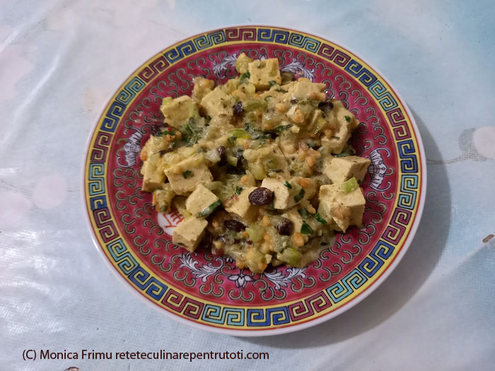 Scurgem bine tofu, tăiem cubulețe, presărăm praful condimentat, prăjim în uleiul încins 2 minute și scoatem pe hârtie absorbantă. În uleiul rămas prăjim morcovul 1 minut. Îl amestecăm cu iaurtul, sarea și piperul. Tăiem mărunt frunzele de țelină și grosier cele de spanac. Le punem într-un castron, amestecăm cu iaurtul și cubulețele de tofu. Punem în frigider 30 minute și putem servi.