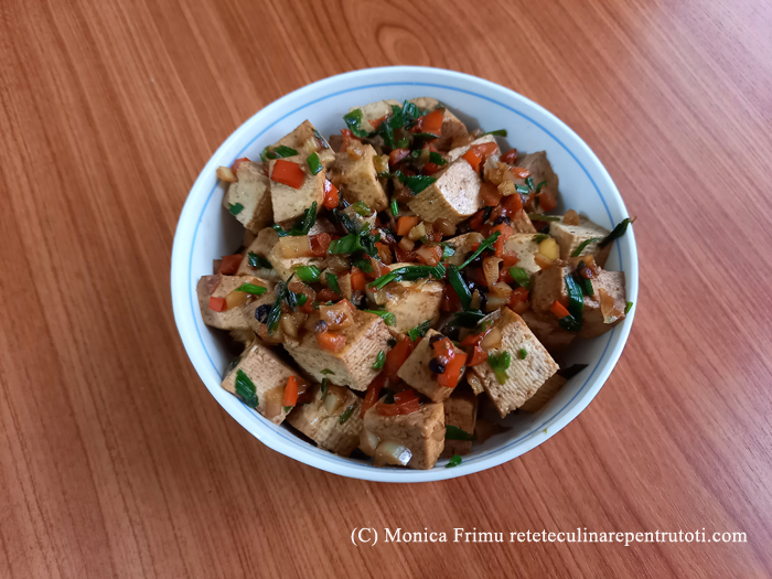 – 180 g tofu, 50 g ardei roșu și galben tăiați cubulețe, 10 g chives, 2 linguri sos de soia, 1 linguriță oțet de orez, ½ linguriță mix boabe de piper colorat, 1 lingură ulei vegetal