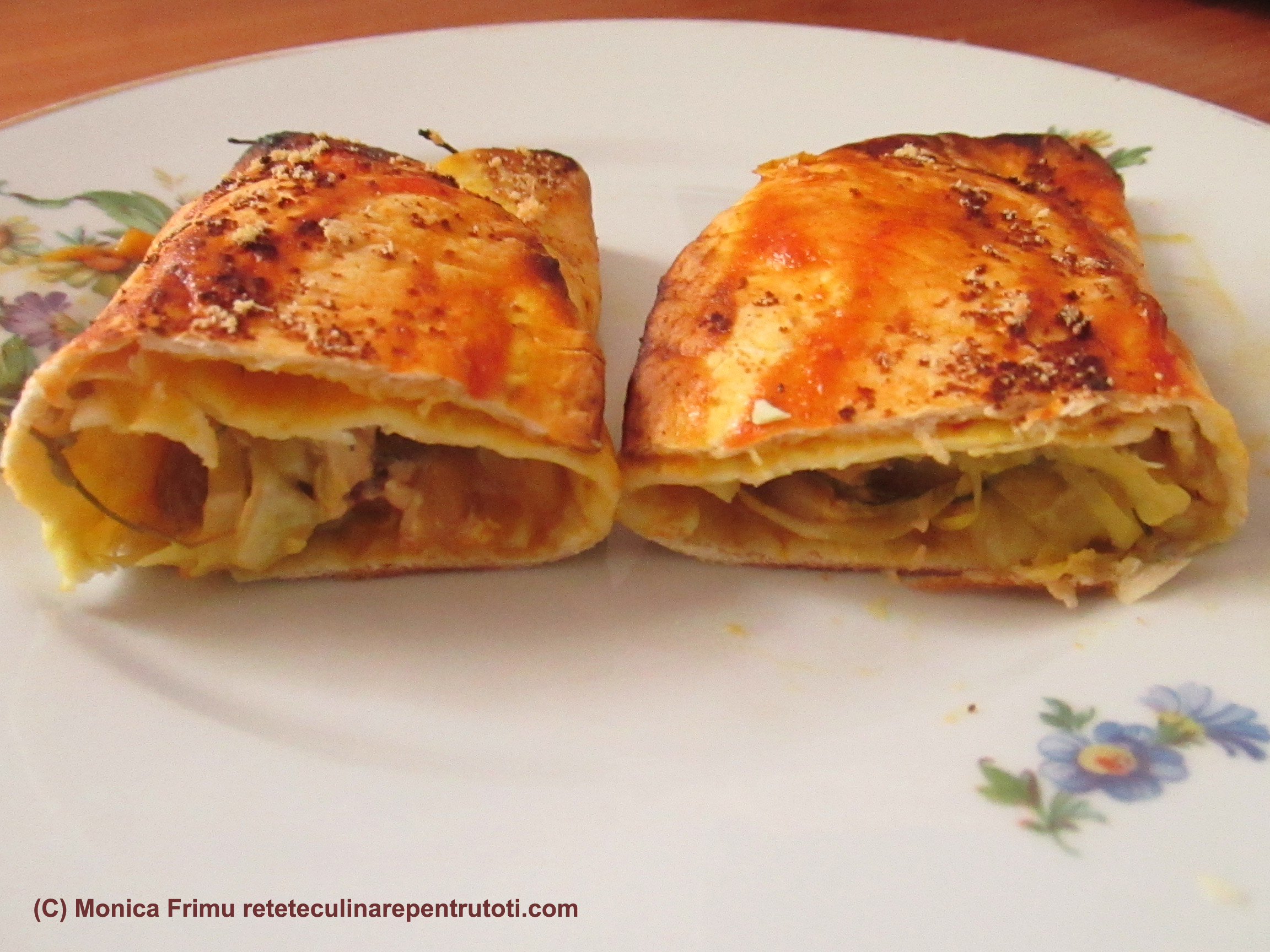 – 6 foi de tortilla, 150 g piept de pui dezosat și fără piele, 70 g praz-partea verde, 80 g ardei portocaliu, 80 g brânză de vaci, 6 triunghiuri de brânză topită cu cașcaval, 70 g smântână, 150 ml vin alb demisec, 2 linguri mix boabe de piper negru-roșu-alb, ½ linguriță praf de curry exotic, ketchup dulce, 1 lingură ulei de arahide, 30 g unt, sare