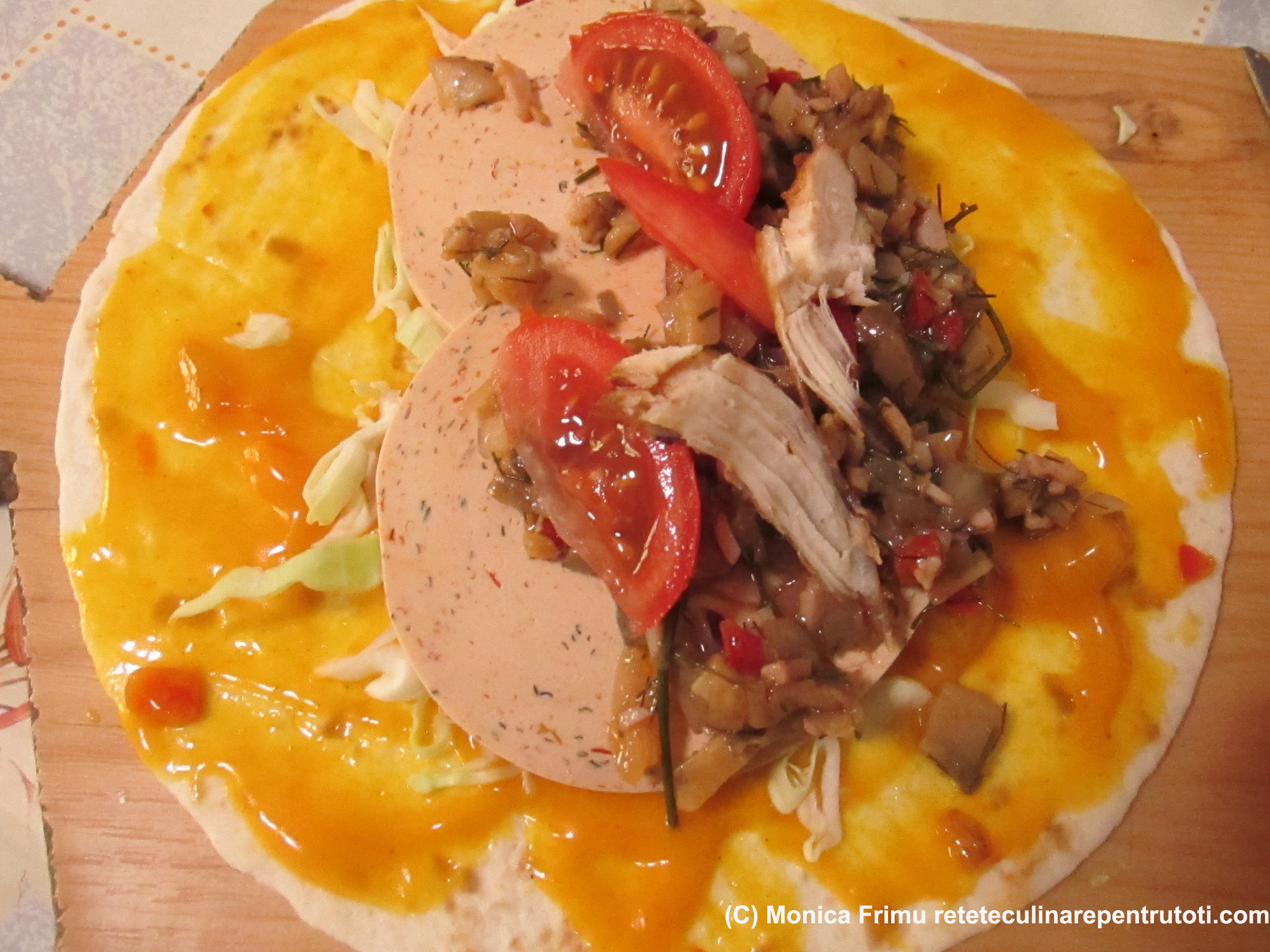 Acoperim cu o foaie de tortilla și presăm. Întindem pe toată suprafața 1/3 din amestecul cu brânză de vaci, presărăm 1/3 ardei și 2 triunghiuri de brânză tăiate bucățele. Repetăm operațiile cu cele 4 foi rămase. Deasupra picurăm din loc în loc ketchup.