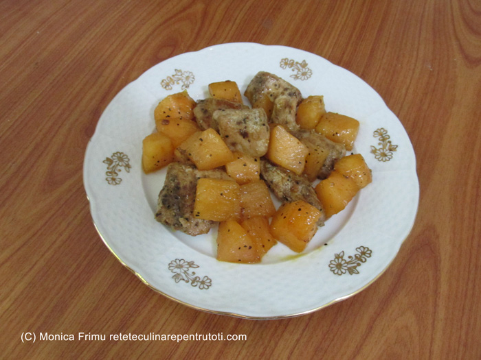 Tăiem carnea cuburi, acoperim cu condimente Quesadilla, turnăm uleiul de floarea-soarelui, acoperim și punem în frigider până a doua zi. Lăsăm să stea la temperatura camerei 30 min apoi prăjim într-o tigaie teflonată 3-4 min. până se rumenesc pe toate părțile. Punem de o parte. Tăiem pepenele cuburi și amestecăm cu zahărul și sarea. Încălzim uleiul cu chilli și prăjim pepenele la foc mediu 3 min., presărăm piperul și ținem pe foc 1 min. Adăugăm carnea, amestecăm ușor și gătim 1 min. Servim mâncarea caldă.