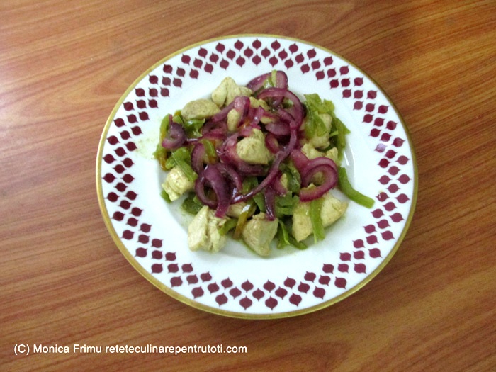 – 300 g piept de pui dezosat și fără piele, 100 g ardei verde curățat, 100 g ceapă roșie, ½ linguriță praf de curry exotic, 1 lingură zahăr, 1 lingură oțet de orez, sare, 2 linguri ulei cu chilli, 1 lingură ulei vegetal