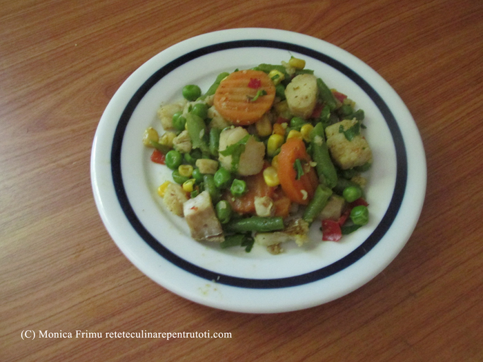 – 200 g file de pește, 1 pungă amestec mexican de legume congelate (450 g), 3 căței de usturoi mari, 1 linguriță condimente pentru pește, 1 linguriță praf Chimichurri, ½ linguriță semințe de coriandru, ¼ linguriță piper roșu măcinat, 1 lingură ulei cu chilli, sare