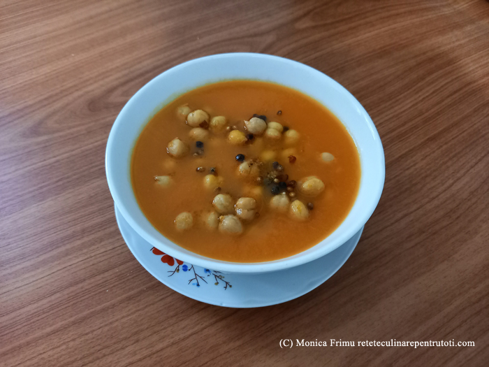 Strecurăm morcovii și ceapa, pasăm cu blenderul, turnăm în supă și încălzim. Adăugăm năutul, porționăm și servim.