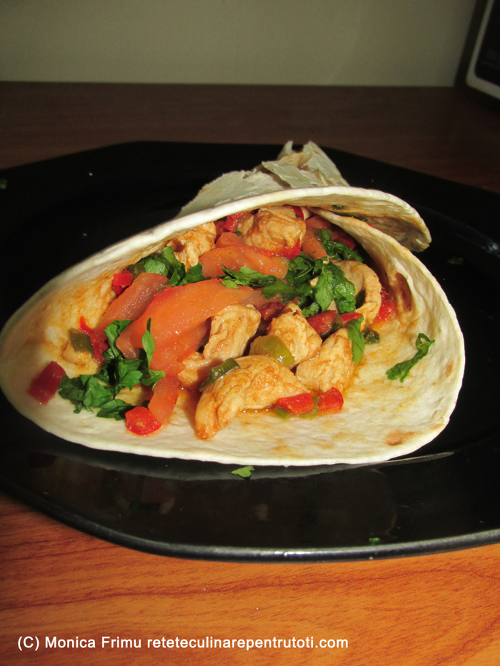 – 200 g piept de pui dezosat și fără piele, 2 lipii, 1 ardei roșu, 2 cepe verzi, ½ lingură condimente Burrito, ½ leg. pătrunjel verde, 1 roșie, 2 linguri ulei cu chilli, sare