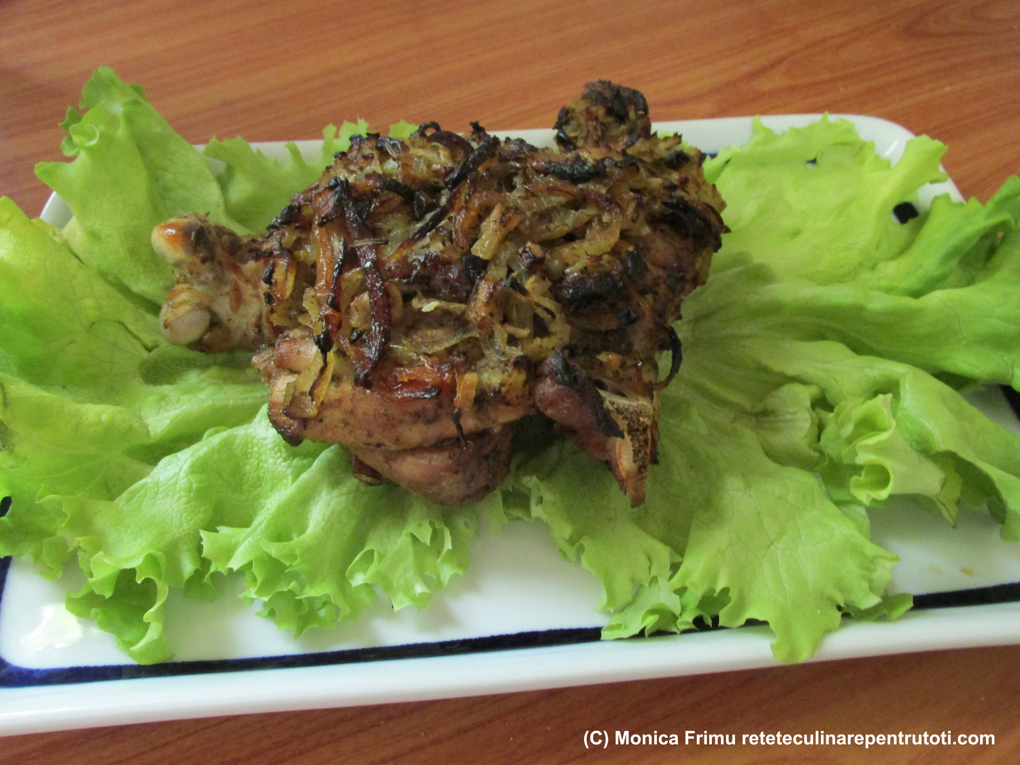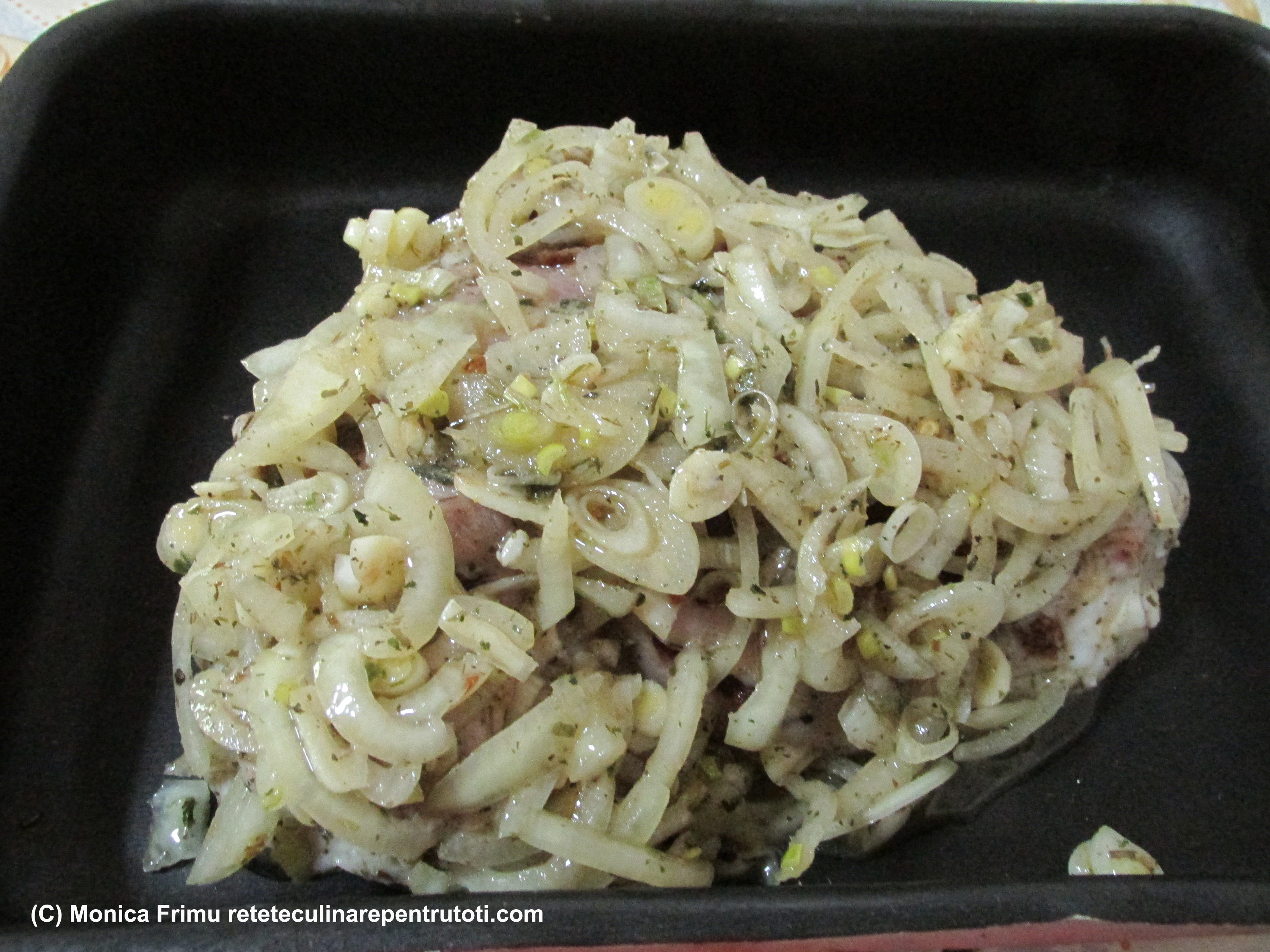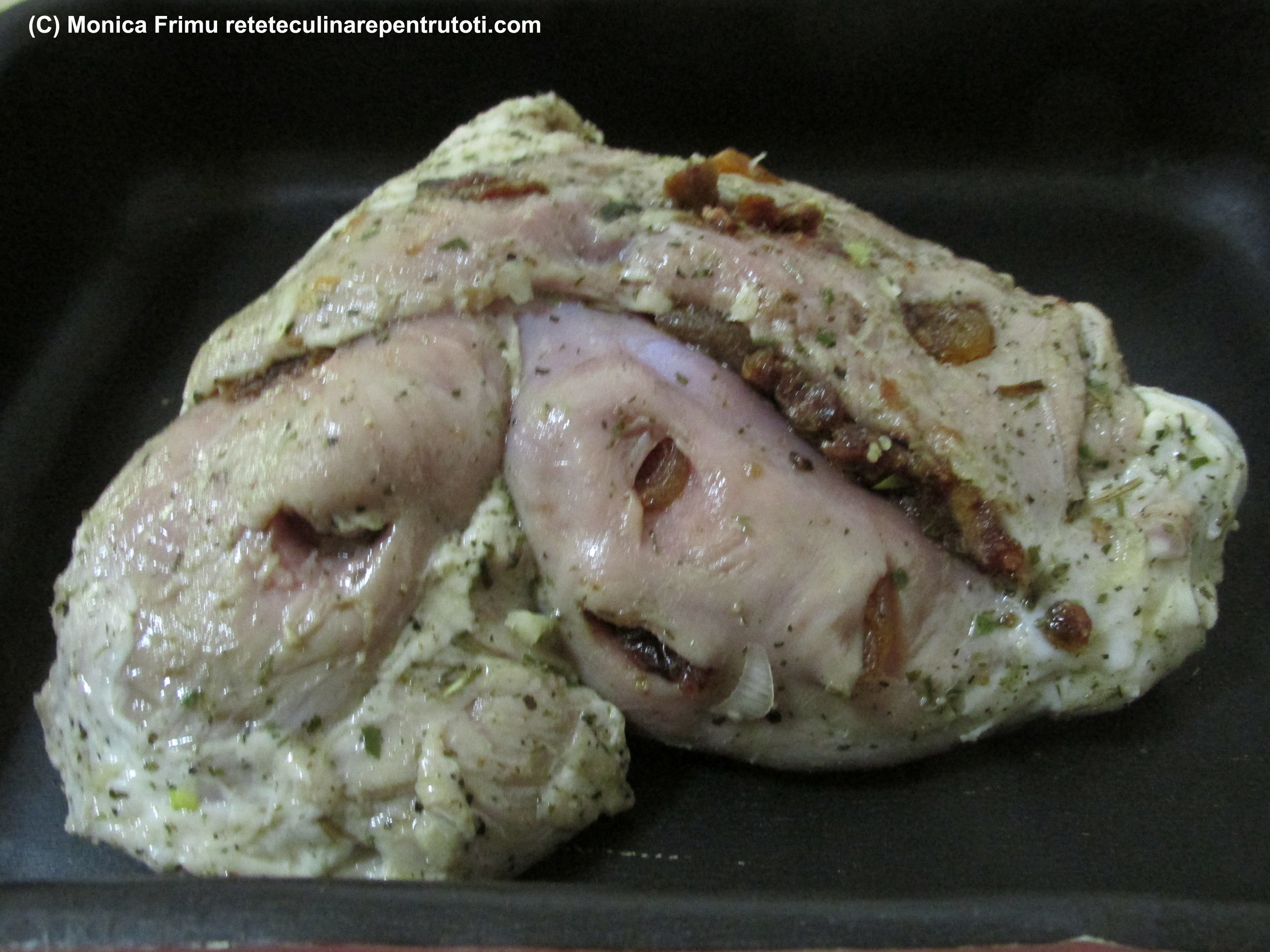 Curățăm ceapa, usturoiul și tăiem feliuțe. Le amestecăm cu condimentele, uleiul, vinul și obținem un baiț. Scoatem carnea, o spălăm, ştergem bine şi o ungem pe toate părţile cu marinata. Ţinem în frigider încă 24 ore.