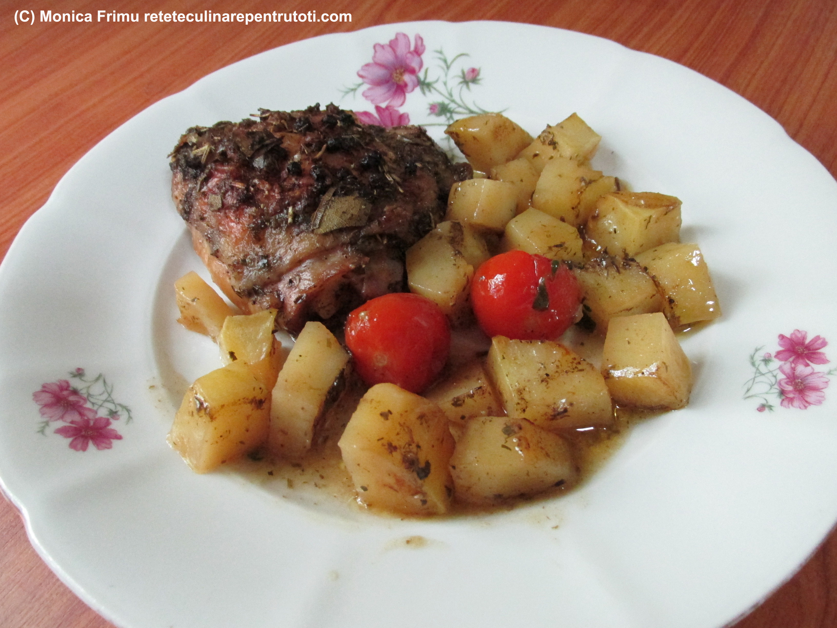 Din când în când o stropim cu sosul din tavă. Când carnea e pătrunsă scoatem folia şi o mai ţinem în cuptor până se rumeneşte.