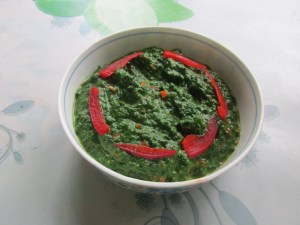 Curățăm spanacul de codițe, spălăm bine și tocăm mărunt. Îl călim într-o lingură ulei de floarea-soarelui, presărăm ½ linguriță sare de Himalaya, turnăm 1 lingură de apă, amestecăm, apoi a doua lingură de apă, usturoiul granulat și fierbem 2 min. amestecând. Răcorim și pasăm cu blenderul. Curățăm morcovul, tăiem mărunt, prăjim în uleiul de chilli, la foc mai mare, 3 min., amestecând. Presărăm ½ linguriță sare de Himalaya, condimentele Chimichurri, punem zahărul și amestecăm până începe să se caramelizeze. Răcim, amestecăm cu spanacul, punem într-un castronel, ornăm cu feliuțe de ardei roșu și servim. Putem păstra în frigider, acoperită.