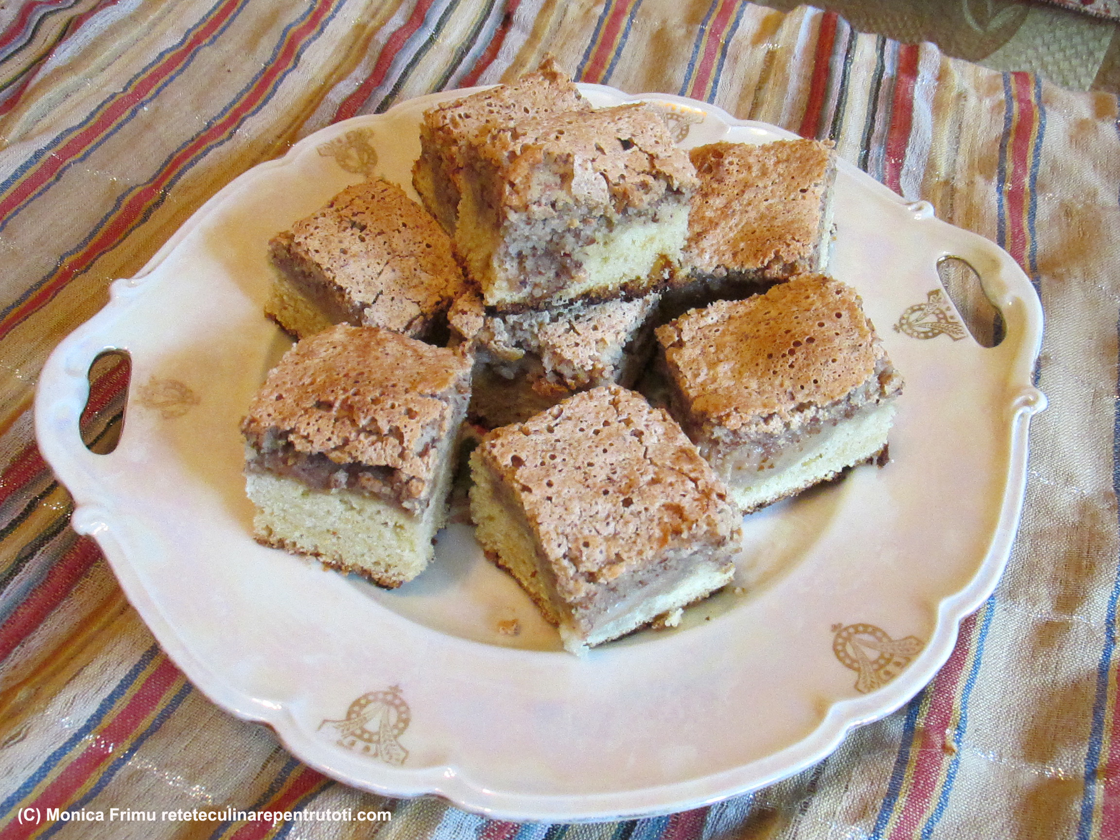 Frecăm gălbenuşurile cu 150 g de zahăr și margarina moale. Adăugăm făina, amoniacul stins în zeamă de lămâie, vanilia şi obţinem un aluat pe care îl întindem într-o tavă tapetată cu hârtie de copt. Peste aluat punem gemul într-un strat uniform. Mixăm albușurile spumă tare cu un praf de sare, adăugăm 250 g zahăr şi mixăm până devin lucioase și cremoase. Încorporăm migdalele măcinate şi turnăm uniform peste gem. Punem în cuptorul preîncălzit la foc mediu (180) aprox. 25 min. (testul cu scobitoarea). Răcim, scoatem pe un platou, porționăm și servim.