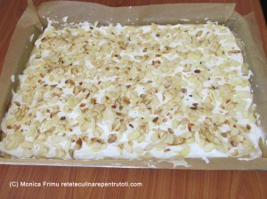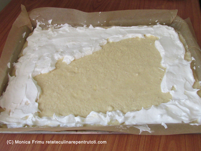 Turnăm compoziția de aluat într-o tavă (30×40 cm) tapetată cu hârtie de copt și nivelăm. Deauspra punem bezeaua și nivelăm.
