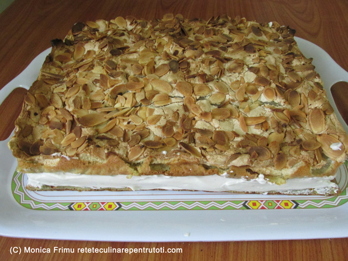 Prăjim sec fulgii de migdale până devin aurii. Mixăm untul moale cu sarea, zahărul praf și vanilia până devine spumos. Adăugăm pe rând gălbenușurile, apoi făina și laptele rece. Separat mixăm albușurile spumă tare cu un praf de sare, adăugăm zahărul tos și mixăm până devin lucioase și cremoase. Le adăugăm treptat peste gălbenușuri amestecând ușor cu o spatulă și omogenizăm. Separat mixăm cele 4 albușuri rămase de la cremă cu un praf de sare, adăugăm treptat zahărul, vanilia și mixăm până devin tari și lucioase, obținând bezeaua.