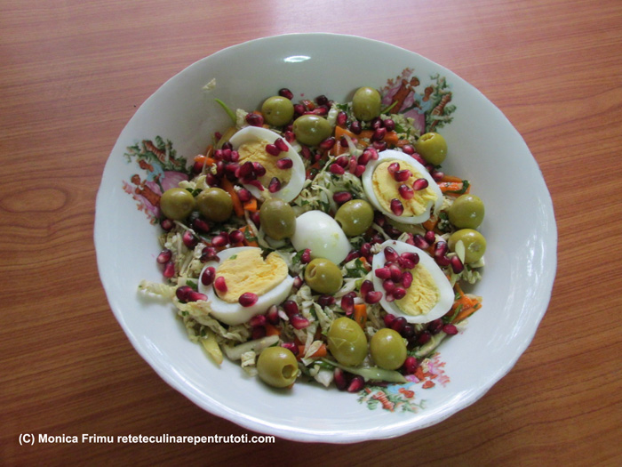 Curățăm și tăiem varza tăiței, morcovul bastonașe, ceapa fâșii pe diagonală, ardeiul feliuțe, tocăm mărunt pătrunjelul. Fierbem oul, tăiem rondele, iar partea albă de la capete mărunt. Într-un bol amestecăm varza, morcovul, ardeiul, albușul de ou, ceapa, pătrunjelul cu sos și ulei. Decorăm cu rondele de ou, măsline și semințe de rodie. Punem în frigider 2 ore, apoi servim.