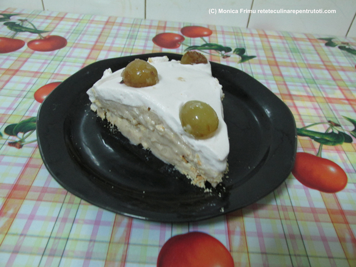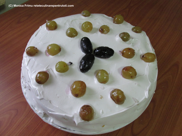 Așezăm compoziția pe un platou. Batem albușurile spumă tare, adăugăm 4 linguri de zahăr, marmelada și amestecăm ușor până se omogenizează. Cu această spumă acoperim complet tortul. Am ornat cu struguri caramelizați.