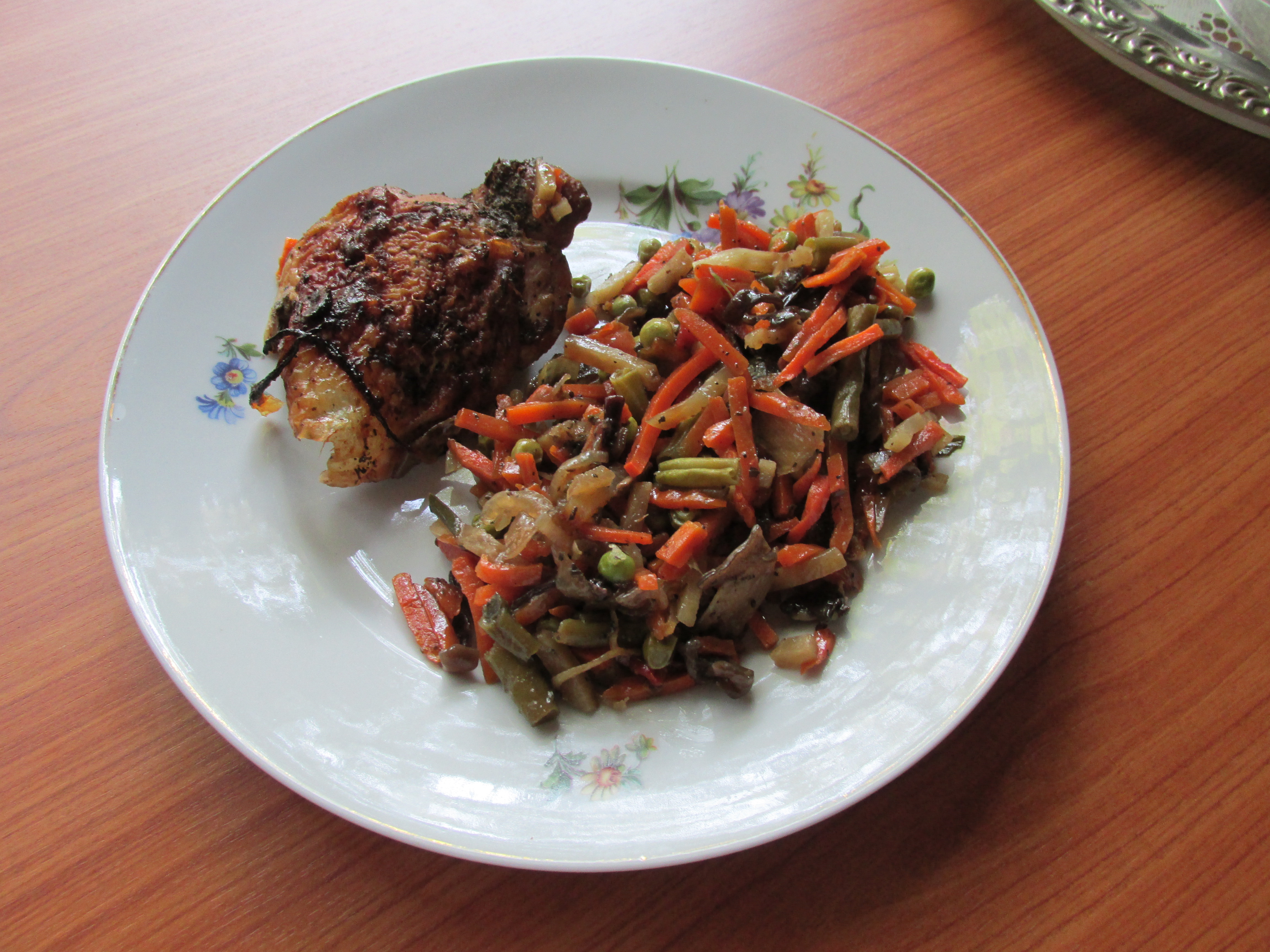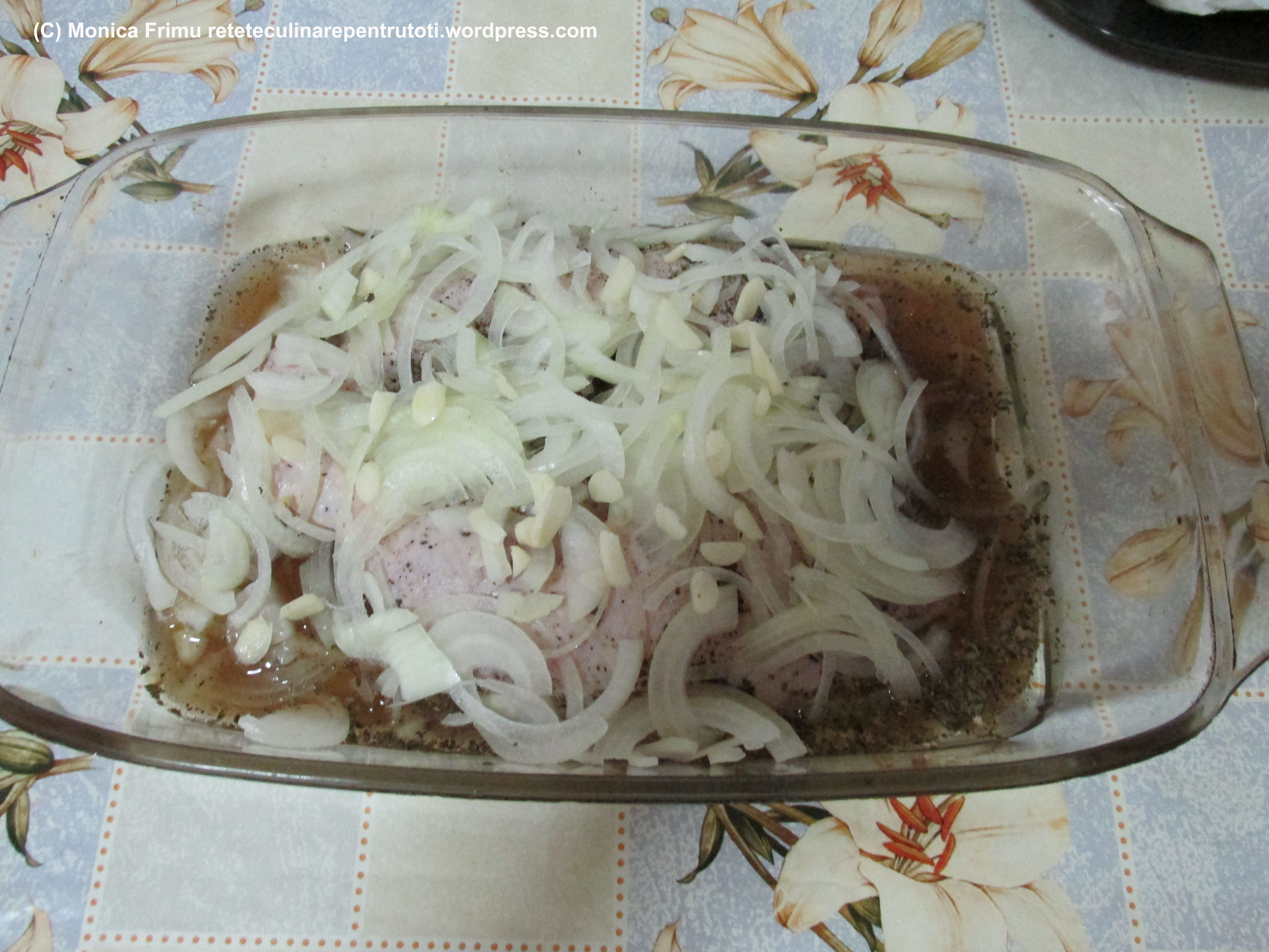 Se porţionează carnea şi se pune la fiert cu legumele. Bucăţile de carne se scot, se trec printr-un amestec din muştar, sare, piper, cimbru, leuştean, se pun în tava unsă cu ulei la cuptor, la foc aproape mic, 45 min, stropind-o din când în când cu zeama de lămâie şi sosul din tavă.