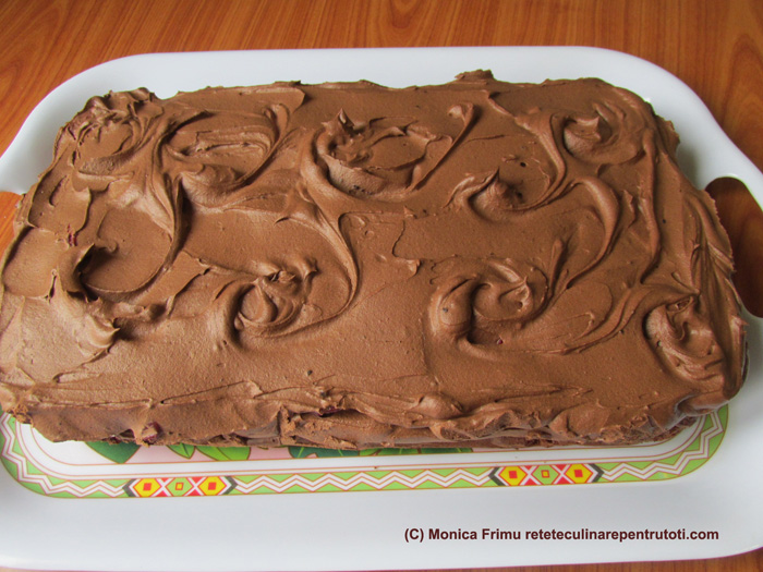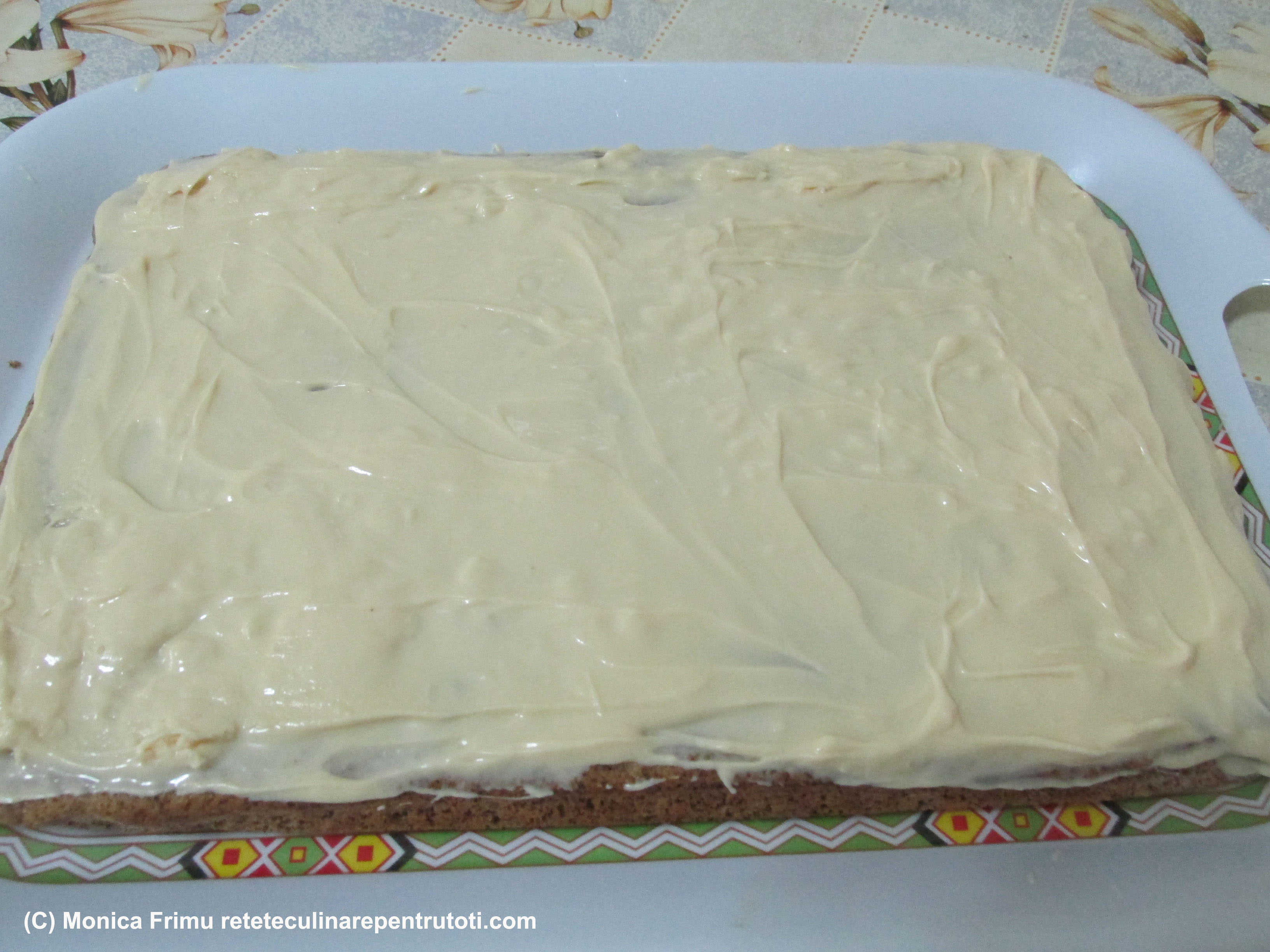 Acoperim cu restul de cremă. Punem în frigider câteva ore. Îndepărtăm folia și așezăm pe un platou.